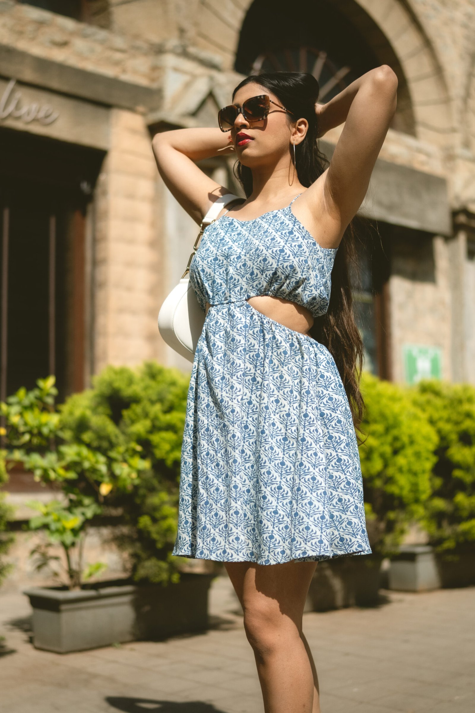 Summer state of mind. This flirty cut-out mini features a dreamy indigo print and a flattering A-line fit. Perfect for sunny days and warm nights.