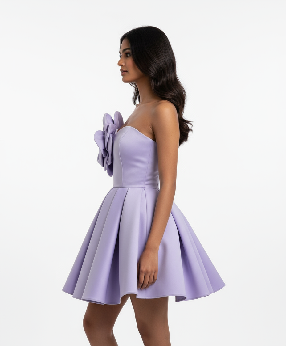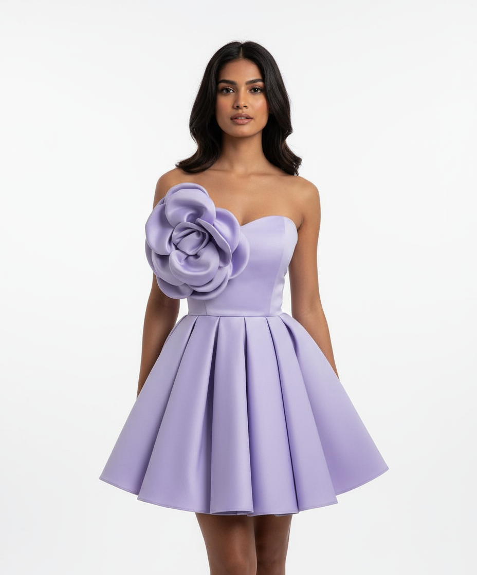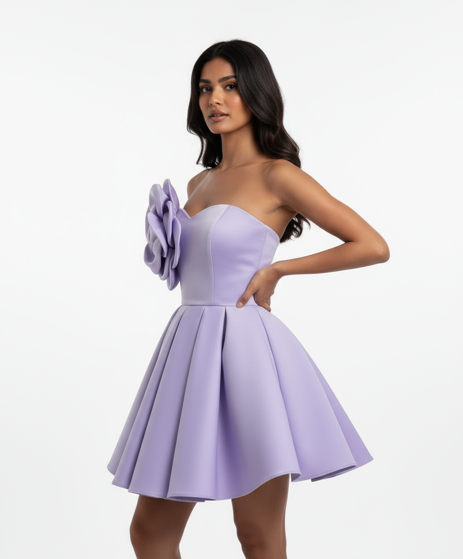 A stunning lavender mini dress featuring a sweetheart neckline and a bold 3D flower detail on the bodice. The fit-and-flare silhouette adds a playful yet elegant touch, while the structured fabric gives it a smooth, flattering shape. Perfect for parties, date nights, or any special occasion