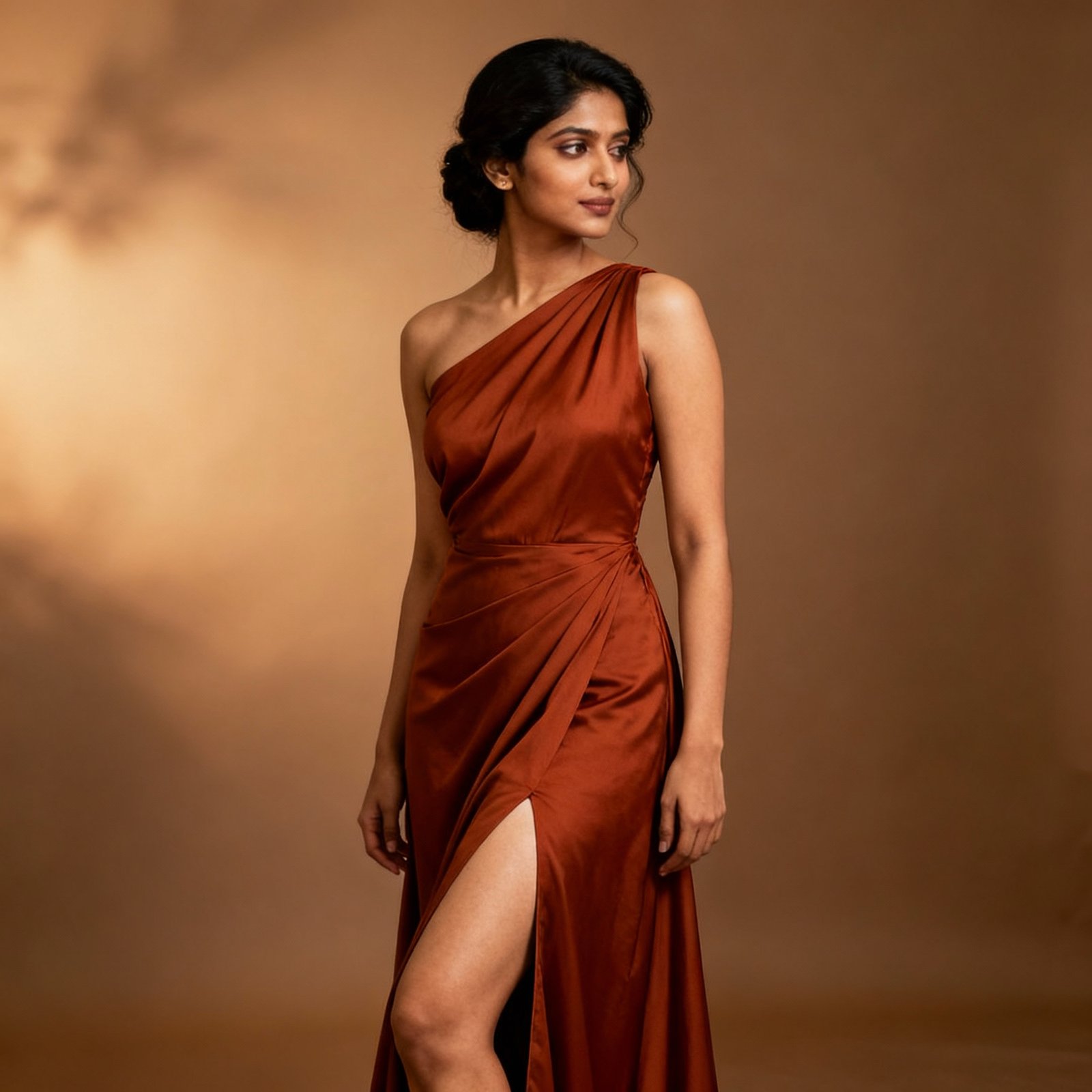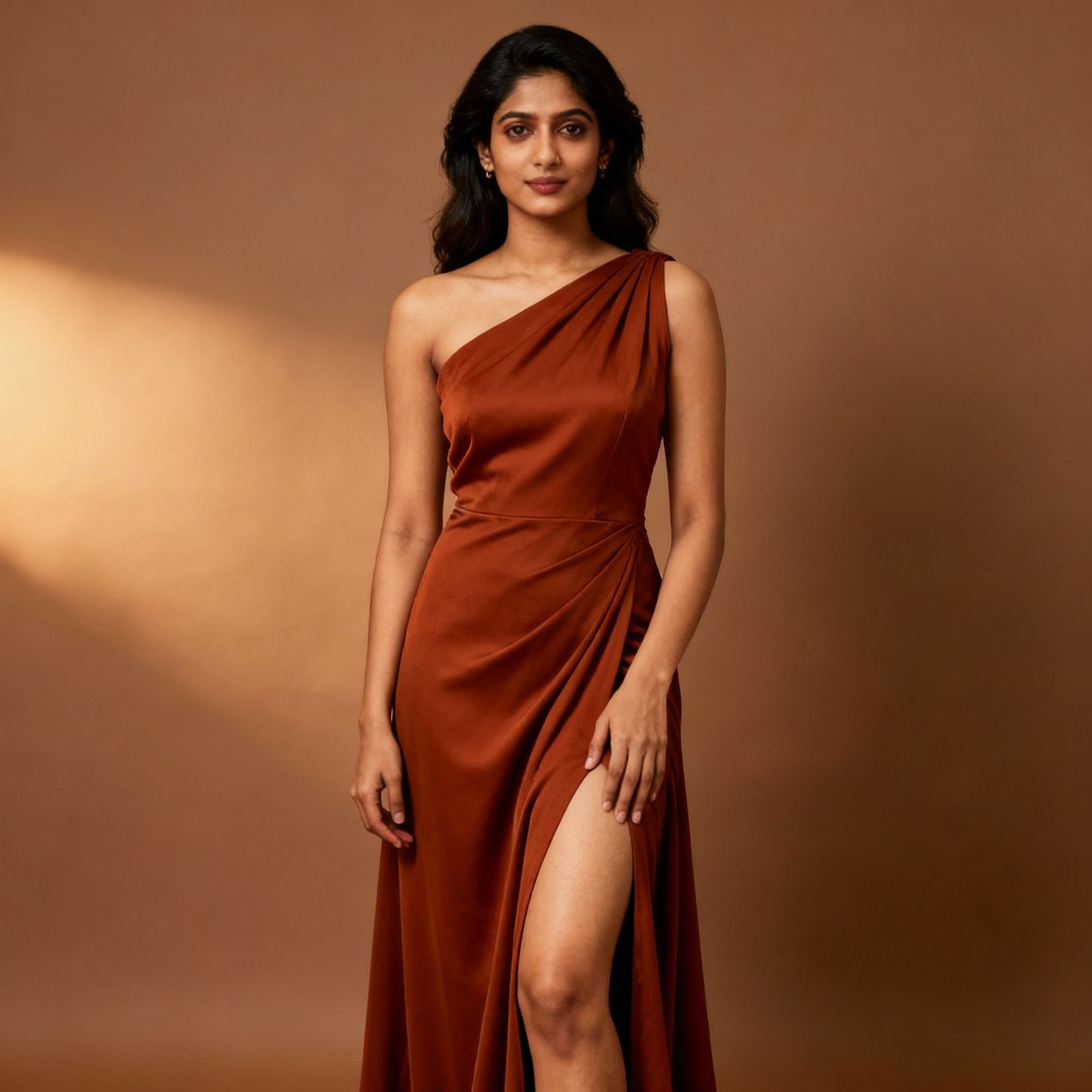 Make a statement in this stunning rust-colored maxi dress. The luxurious satin fabric drapes beautifully, creating a sleek and sophisticated silhouette. The one-shoulder design adds a touch of modern elegance, while the thigh-high slit adds a hint of allure. Perfect for weddings, galas, or any special occasion where you want to turn heads. This dress is sure to make you feel confident and radiant.