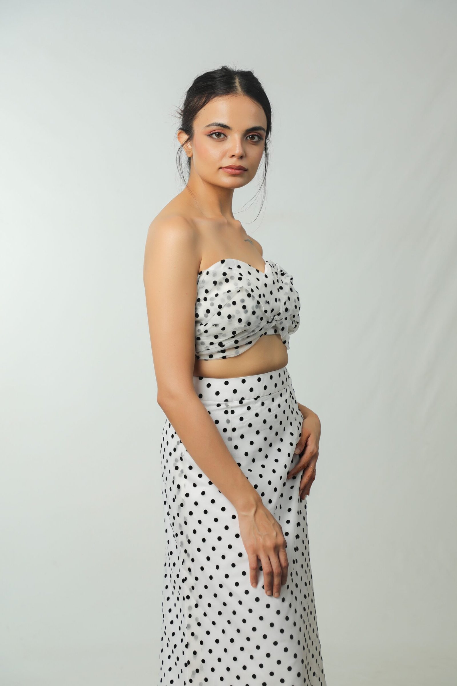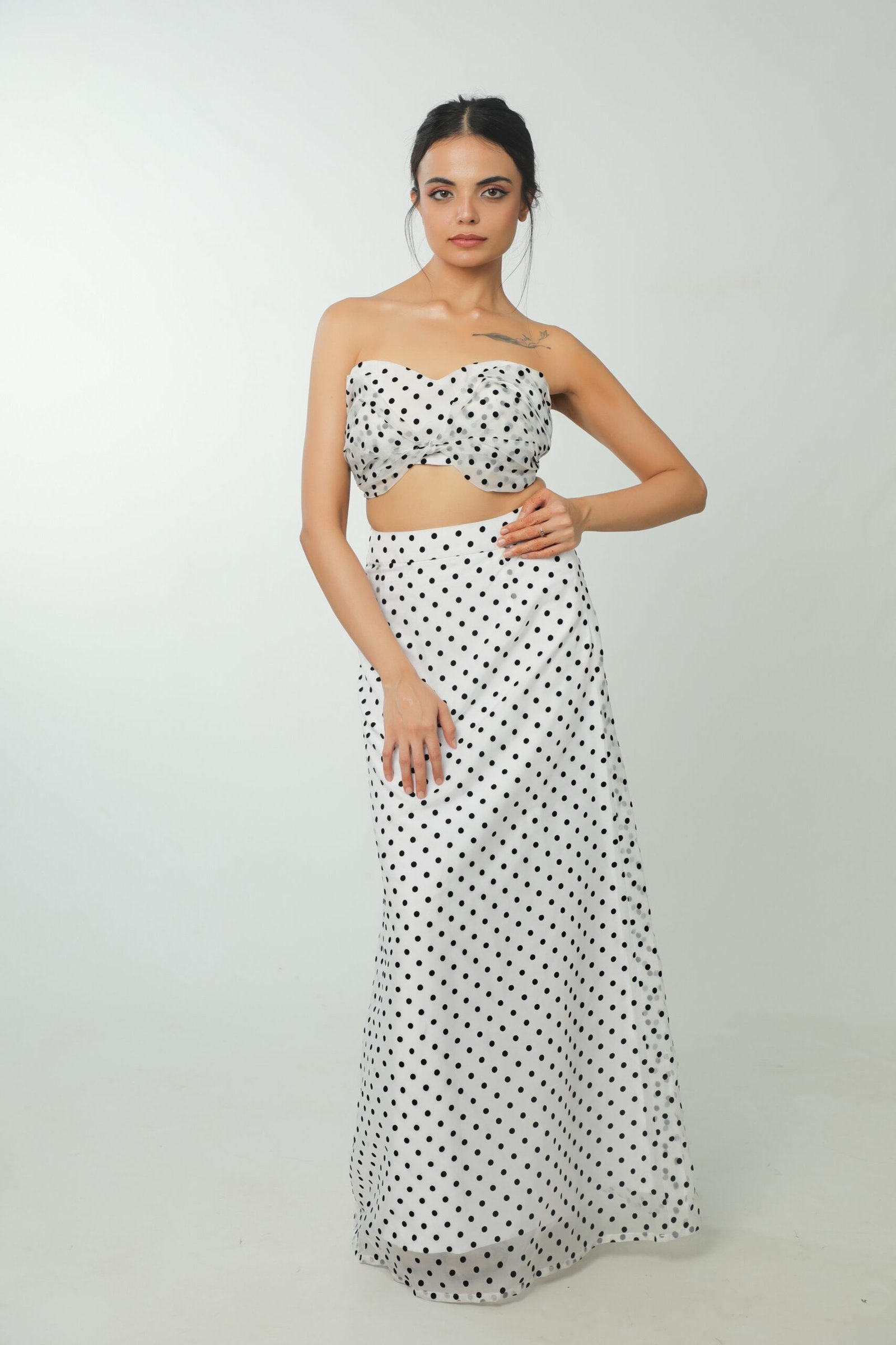 Elevate your wardrobe with this chic polka dot two-piece set from KavzLuxury. Featuring a strapless top and a high-waisted, floor-length skirt, this look blends vintage charm with modern femininity. Designed for effortless style, it’s perfect for garden parties, brunches, or any occasion where you want playful sophistication.